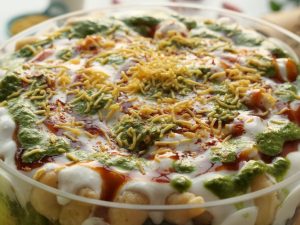 -In a deep serving bowl,add boiled chickpeas,chaat masala,red chilli crushed,prepared hari chutney, mixed vegetable salad,boiled potatoes,prepared meethi chutney,peanuts,sev nimco,prepared yogurt meethi chutney,hari chutney,papri,boiled whole green gram,chaat masala,dahi phulkiyan, yogurt,meethi chutney,hari chutney,red chilli crushed,sev nimco & serve!