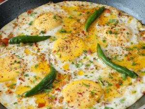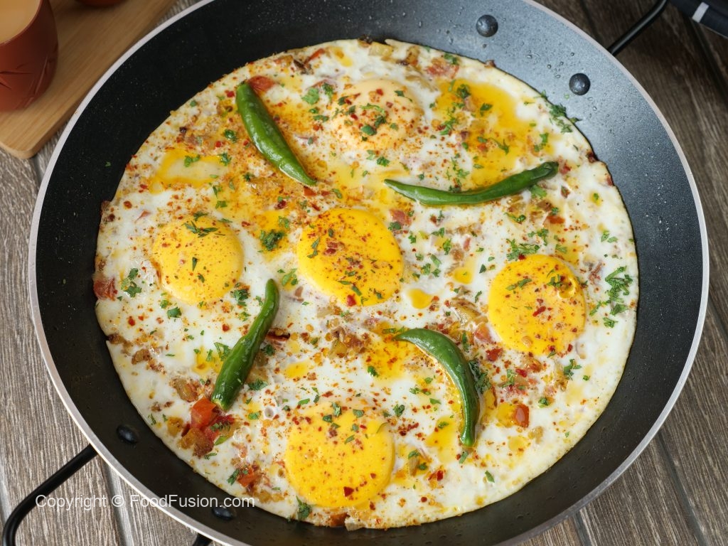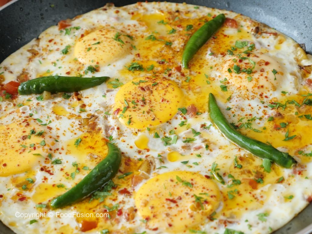 -Ek,ek ker ka anday shamil karein,lal mirch crushed aur hari mirchein dal ker dhak dein aur halki ancch per 6-8 minutes kliya paka lein.