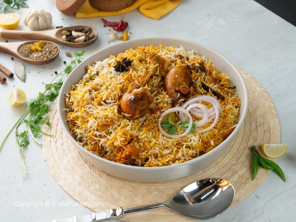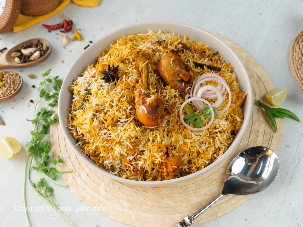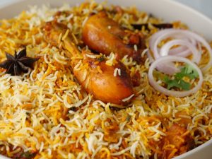 Bowl mein fried pyaz,tamatar,hari mirchein,aalo bhukara,podina,hara dhania,biryani masala aur lemon juice dal ker ache tarhan mix ker lein & side per rakh dein.