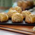 -Sprinkle dry flour on puff pastry & roll out with the help of rolling pin (thickness 0.5cm).