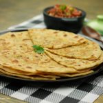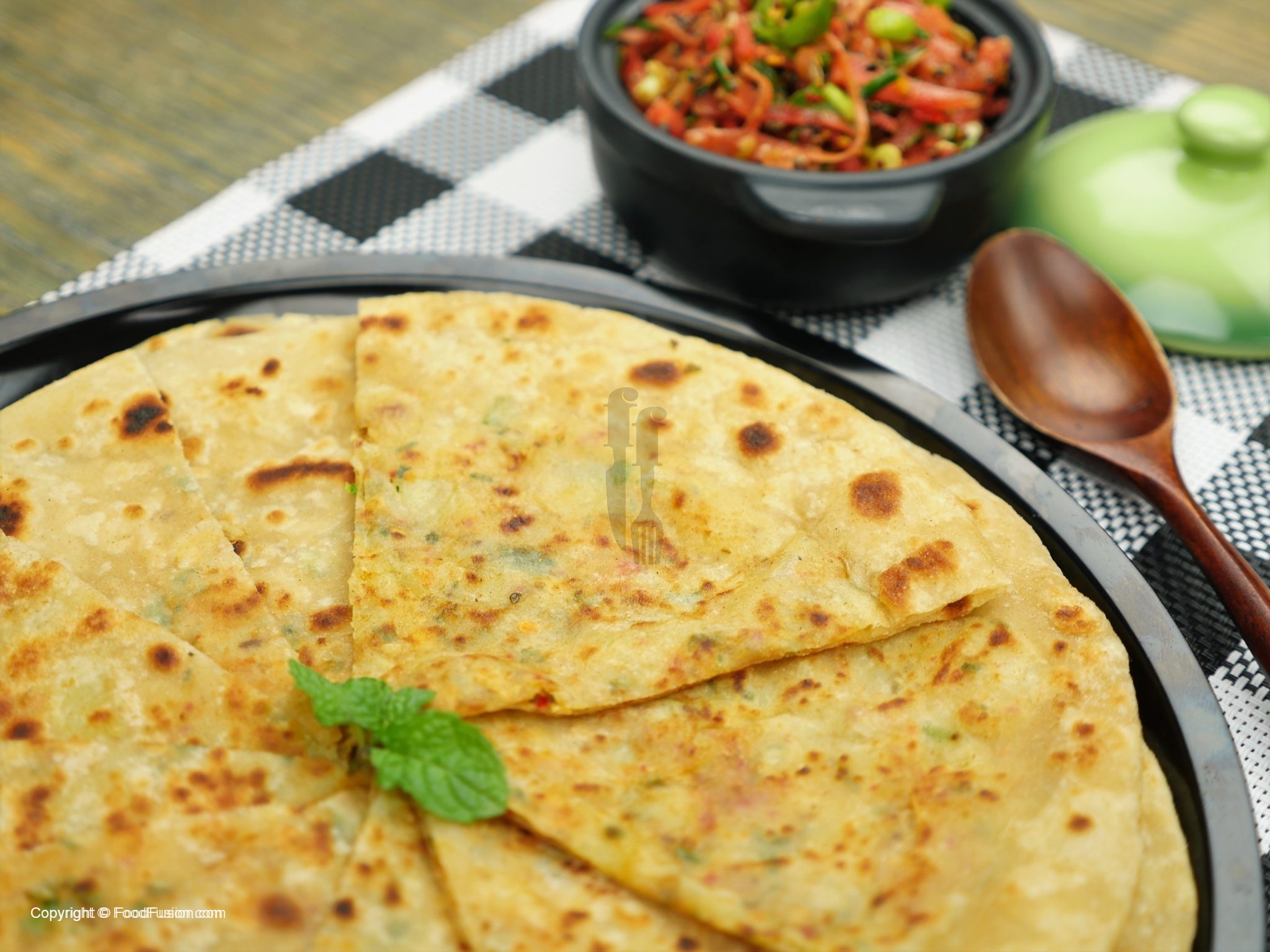 Roll out another dough and put filling/stuffing in the center, place another round dough on top, seal edges and roll out carefully with the help of rolling pin.