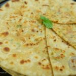 Heat griddle and place rolled paratha on it, fry from both sides with ghee.