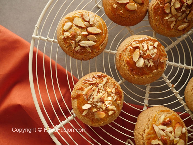 Place them in a baking tray,apply egg yolk with the help of brush,add almonds & press gently (keep some space between them as they expand while baking).