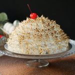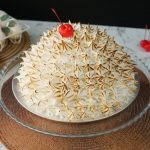 Apply thin layer of prepared meringue all over the cake and decorate with meringue flowers.