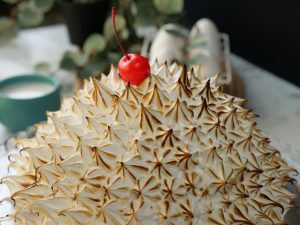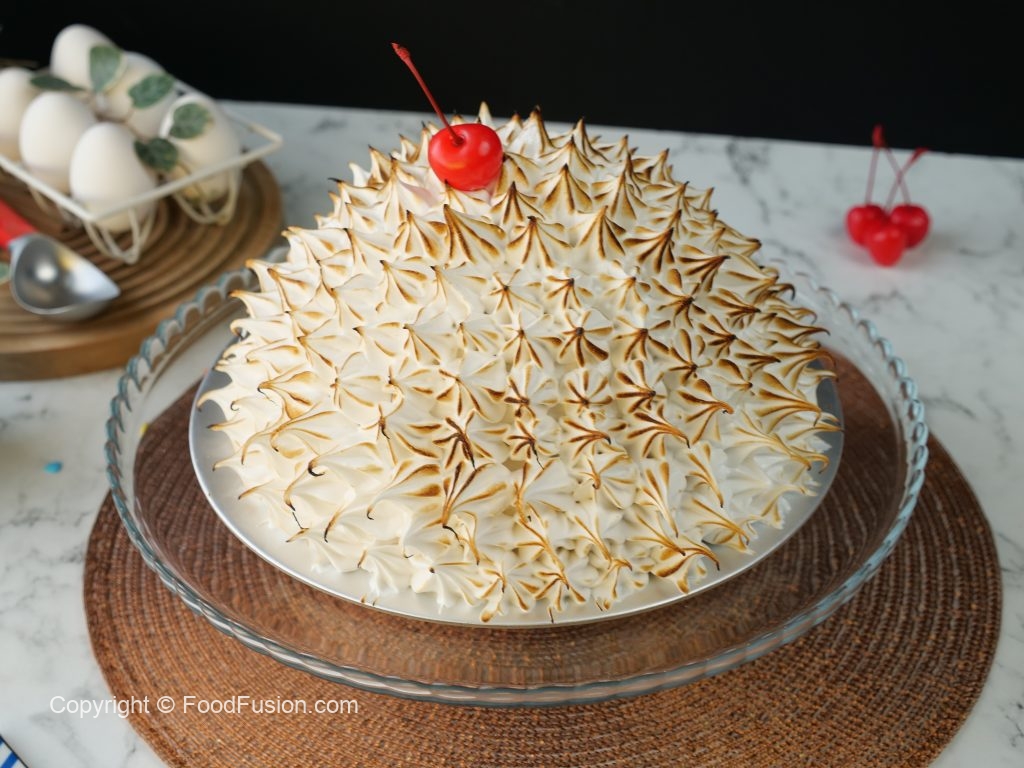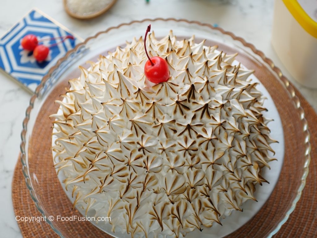 Blow torch sa meringue ko toast ker lein & slices mein cut ker ka serve karein!