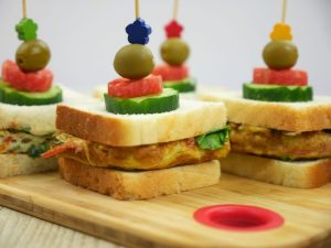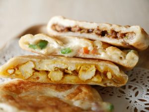 Pour the mixture in the tray compartments and put cheese and few olives on top of it.
