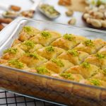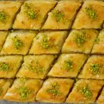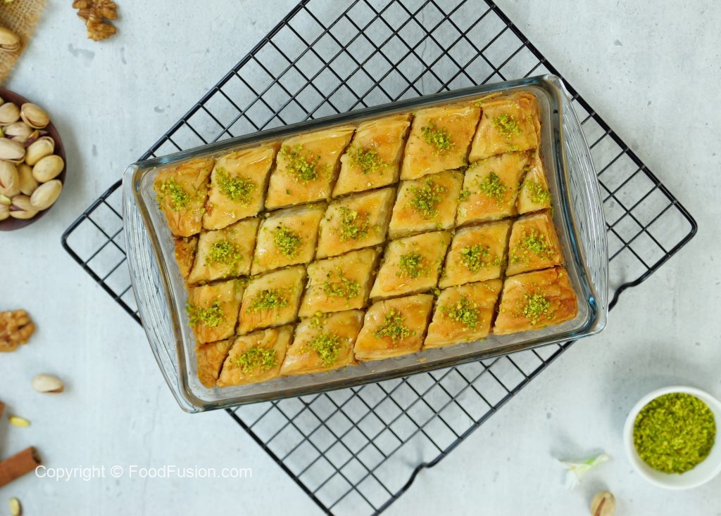 -Cut into diamond or square shapes of bakhlava using a sharp knife & separate the side of pan.