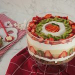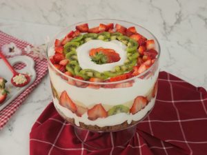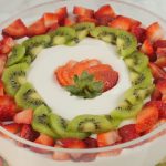 -Add olper’s whipped cream,strawberry puree,add strawberry,pineapple & kiwi slices.