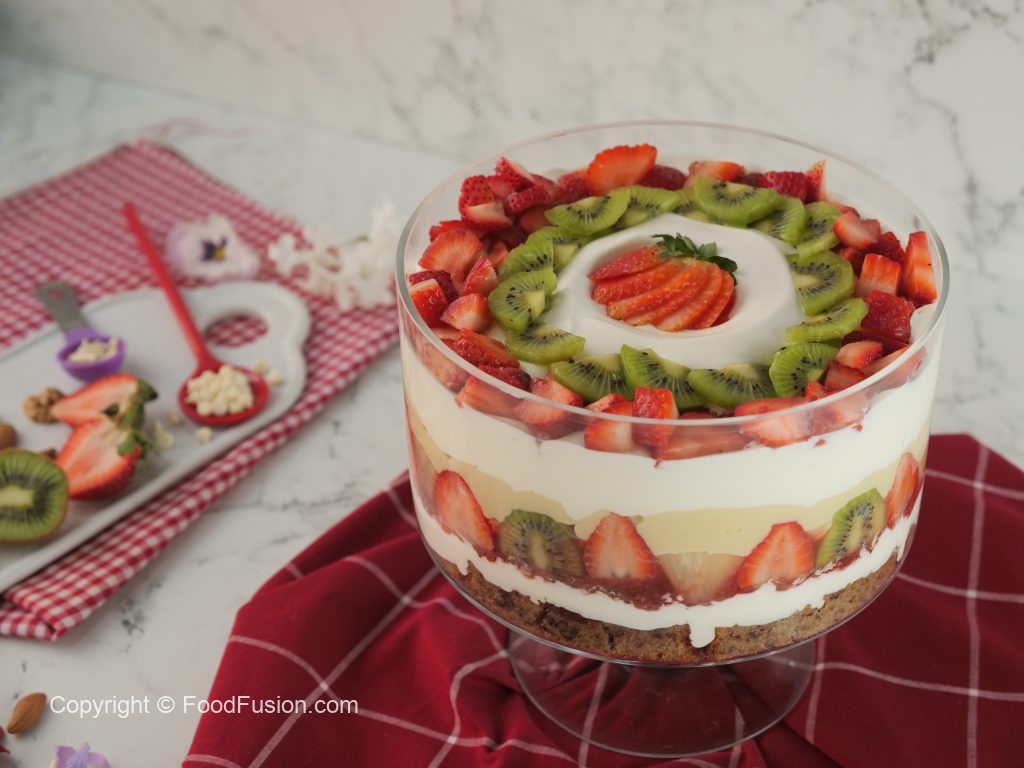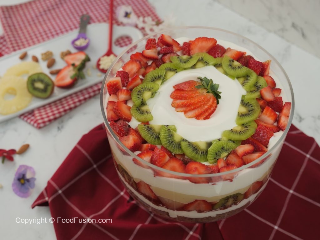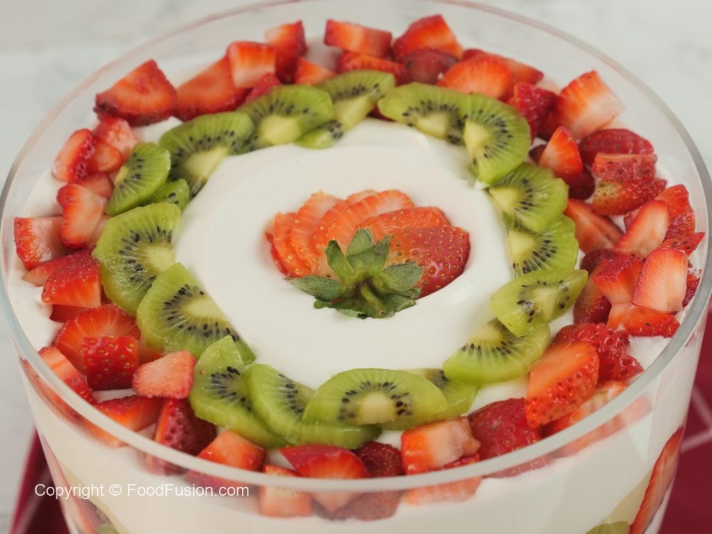 -Olper’s whipped cream aur strawberry puree dal ker pheela lein,strawberry,pineapple aur kiwi ka slices laga lein.