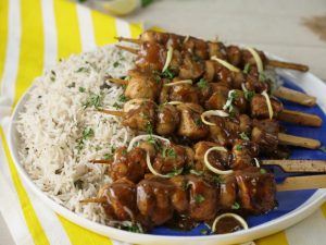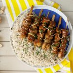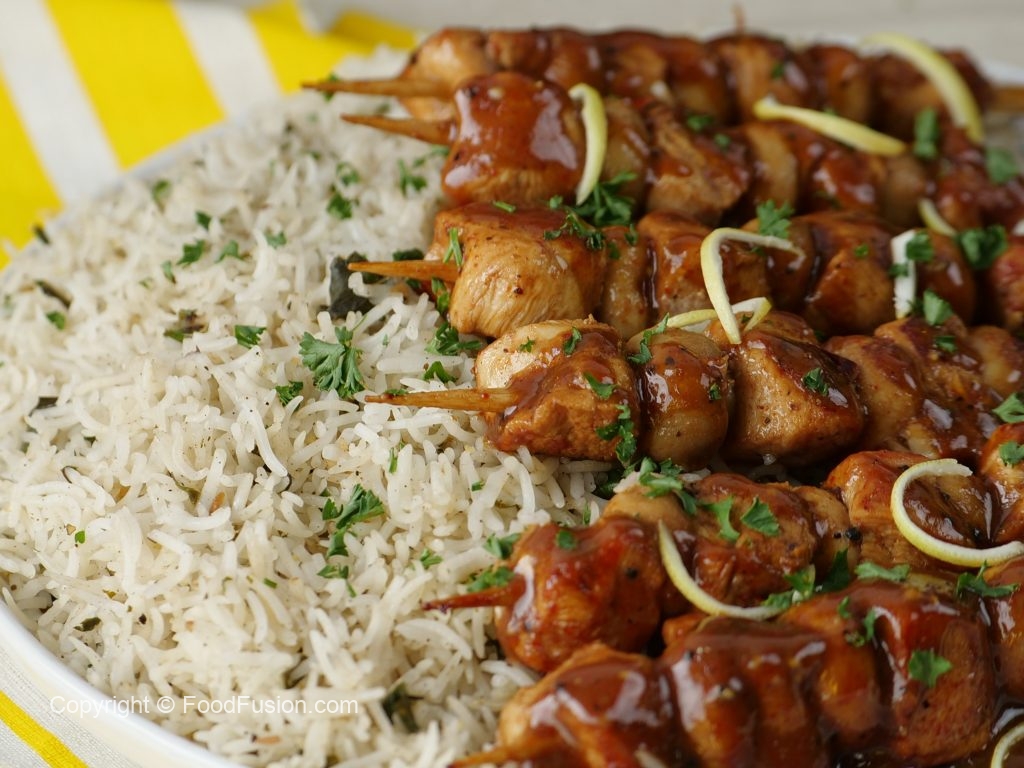 Serve lemon herb rice with chicken & mushroom skewers,drizzle prepared BBQ sauce and garnish with lemon skin,fresh parsley & serve!