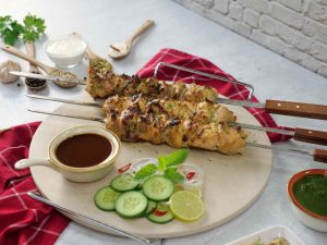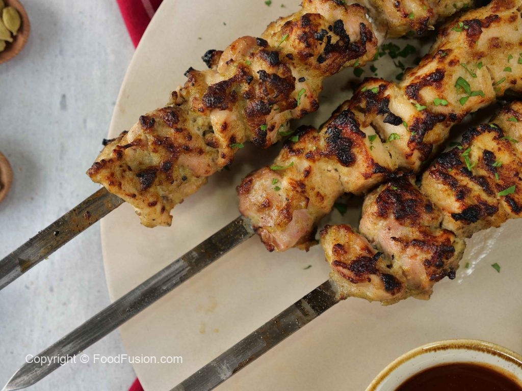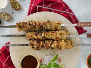 -Chicken pieces ko metal skewers mein lagayein (5 skewers bana lein).