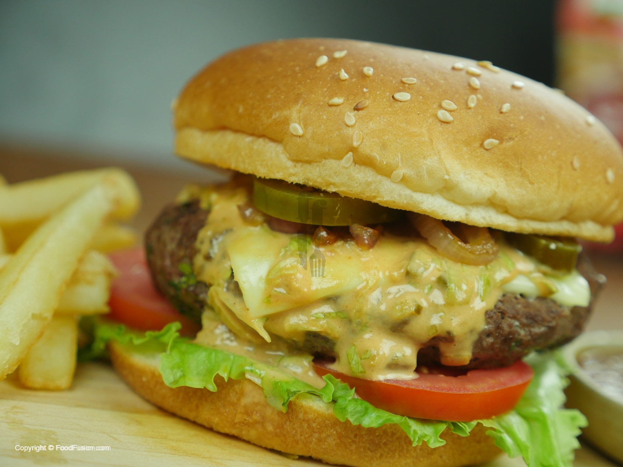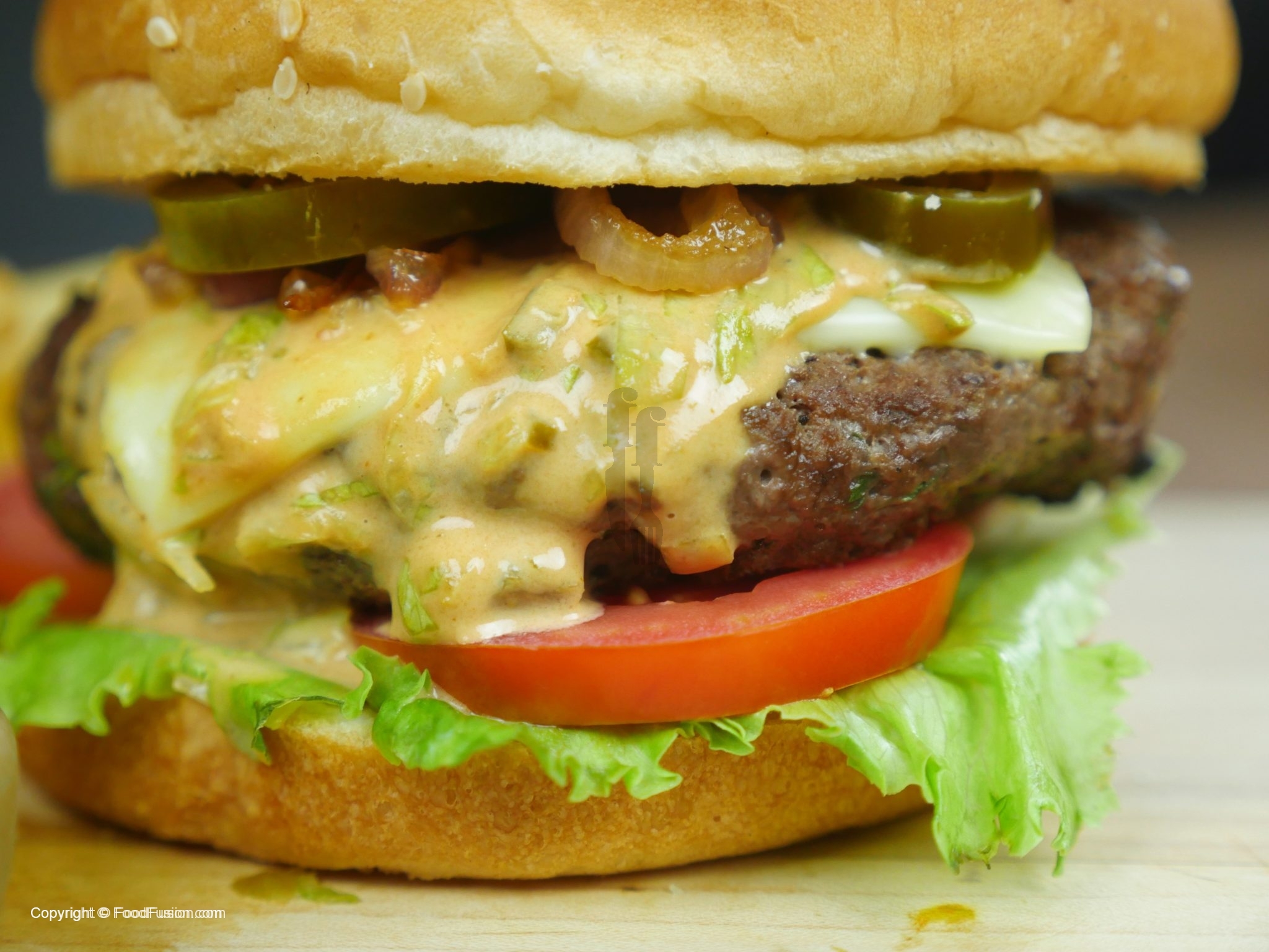 In assembling you can add any vegetable of your choice and assemble burger any ways you like. How we did is: On bun spread mayonnaise, ice burg lettuce leaf, tomato slices, beef patty with cheese, fusion sauce, caramelized onion or raw onion slices, jalapenos slices and top bun.
