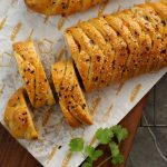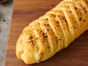 -Brush ki madad sa braided bread per anda laga lein,lal mirch crushed aur safed til chirak lein (makes 2 large or 3 medium breads).