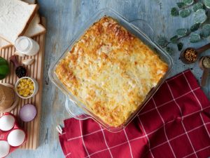 In a baking dish,add & spread prepared white sauce,bread slices,prepared vegetable sauce,white sauce, cheddar cheese,mozzarella cheese,bread slices,red sauce,white sauce,cheddar cheese,mozzarella cheese,bread slices,pour prepared egg mixture,cheddar cheese & mozzarella cheese.
