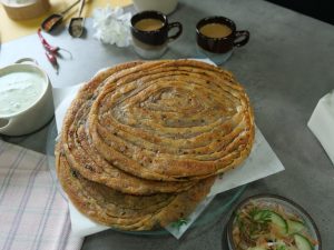 -Add & spread clarified butter,sprinkle garlic,prepared spice mix,fresh coriander,fold the paratha vertically from both sides & roll up.