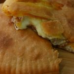 Dough ki adhe side per pizza sauce dal ker pheela lein,cooked minced filling,mozzarella cheese,fresh basil leaves dal ker dosri side ko fold ker lein aur edges ko fork ki madad sa seal ker lein.