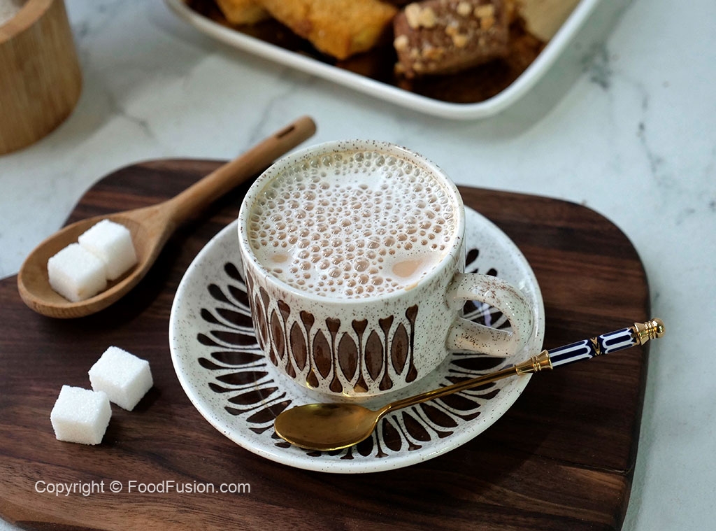 In serving cup,add prepared kehwa,sweetened milk,stir & serve!