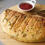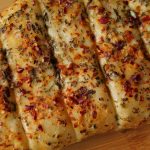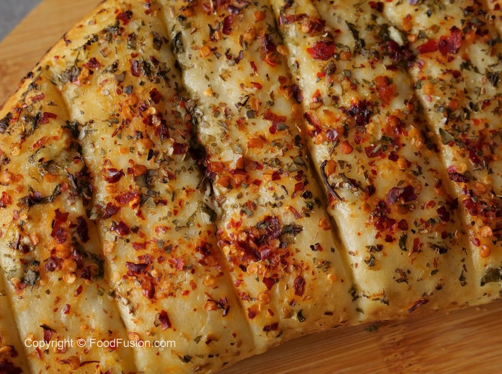 Apply prepared garlic herbed butter & make cuts on it with the help of dough cutter,sprinkle red chilli crushed & dried oregano (Makes 2).