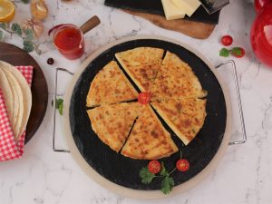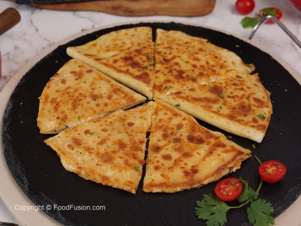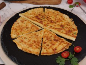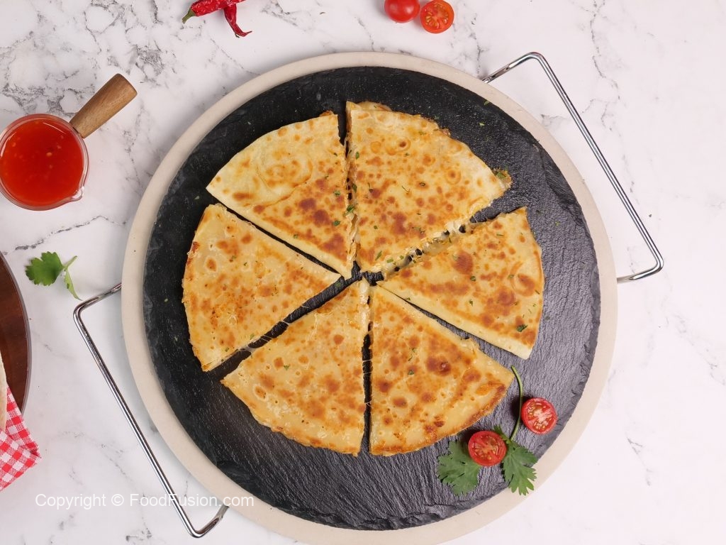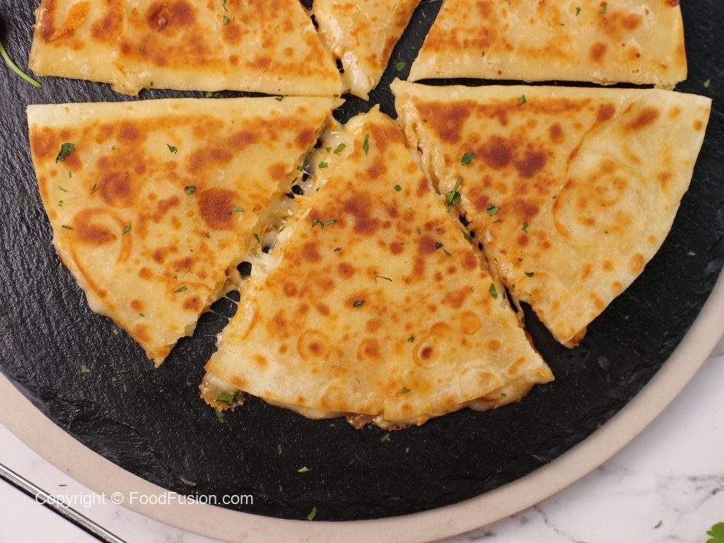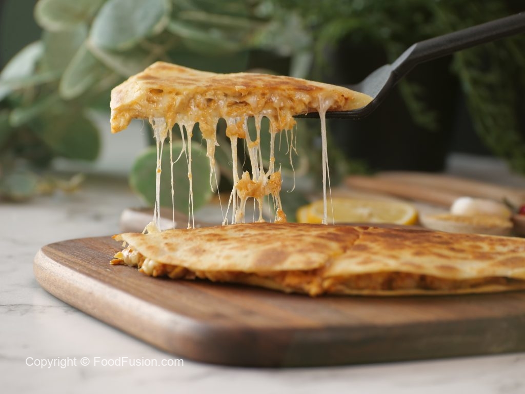 -Tortilla per tayyyar chicken & cheese filling ko ek side per dal ker pheela lein aur dosri side per flip ker lein (makes 5-6).