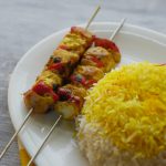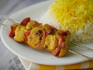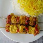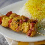Pyaz,red bell pepper aur chicken boneless cubes ko skewers per laga lein aur baqi bache hoye marinade bhi laga lein (makes 10-12).