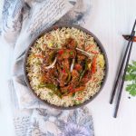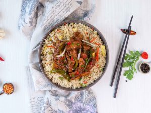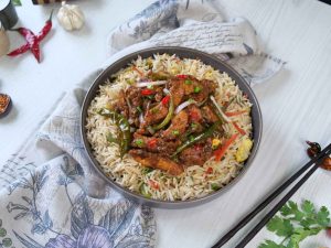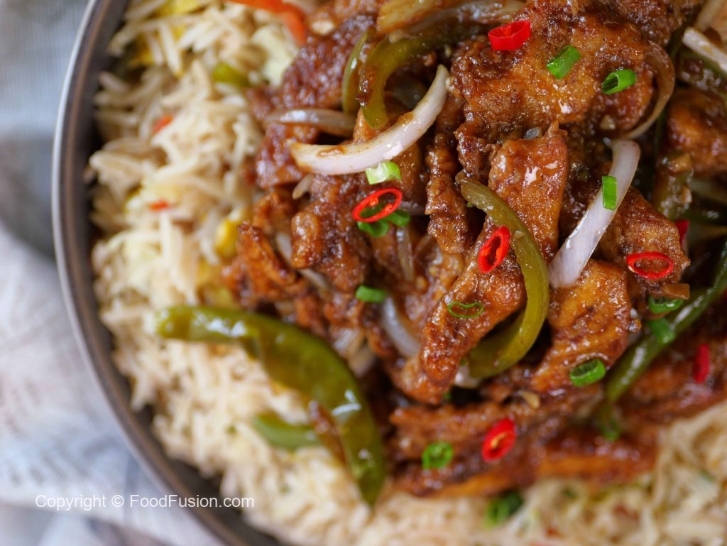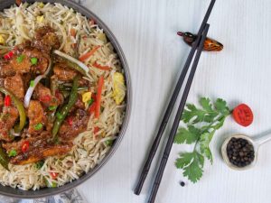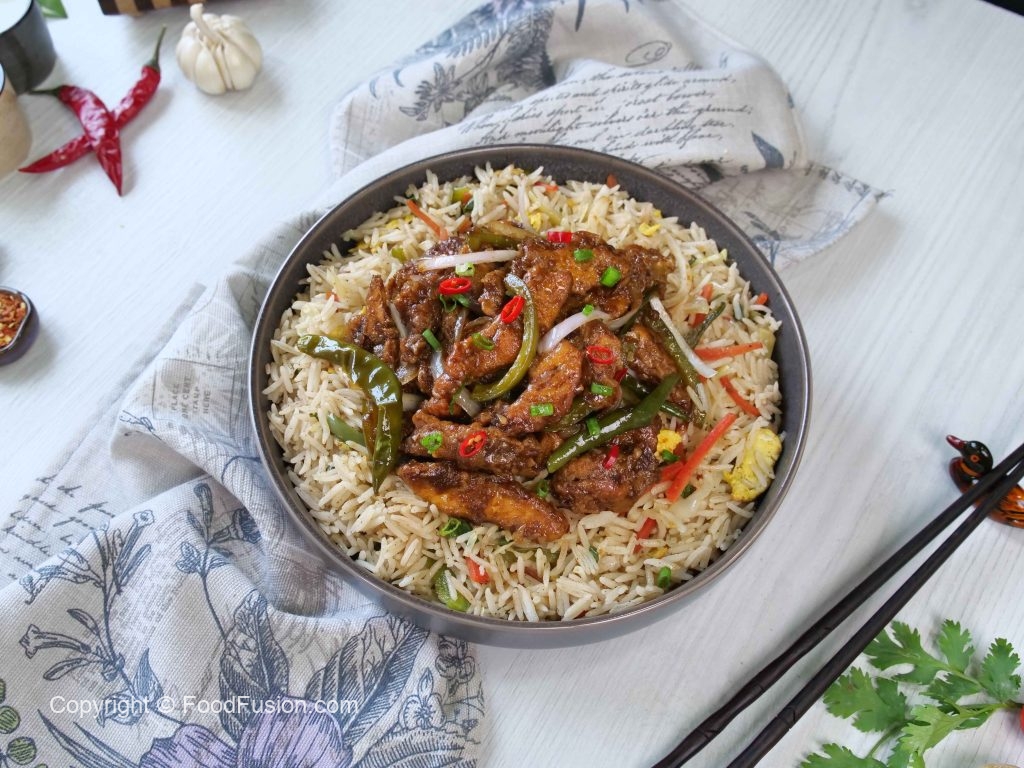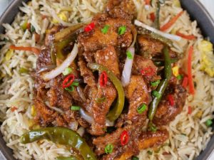 -Boiled chawal,kali mirch powder,pink salt,safed mirch powder,chicken powder,soy sauce,chilli sauce aur sirka dal ker ache tarhan mix karein aur tez ancch per ek minute kliya paka lein