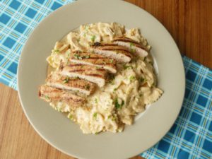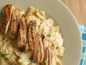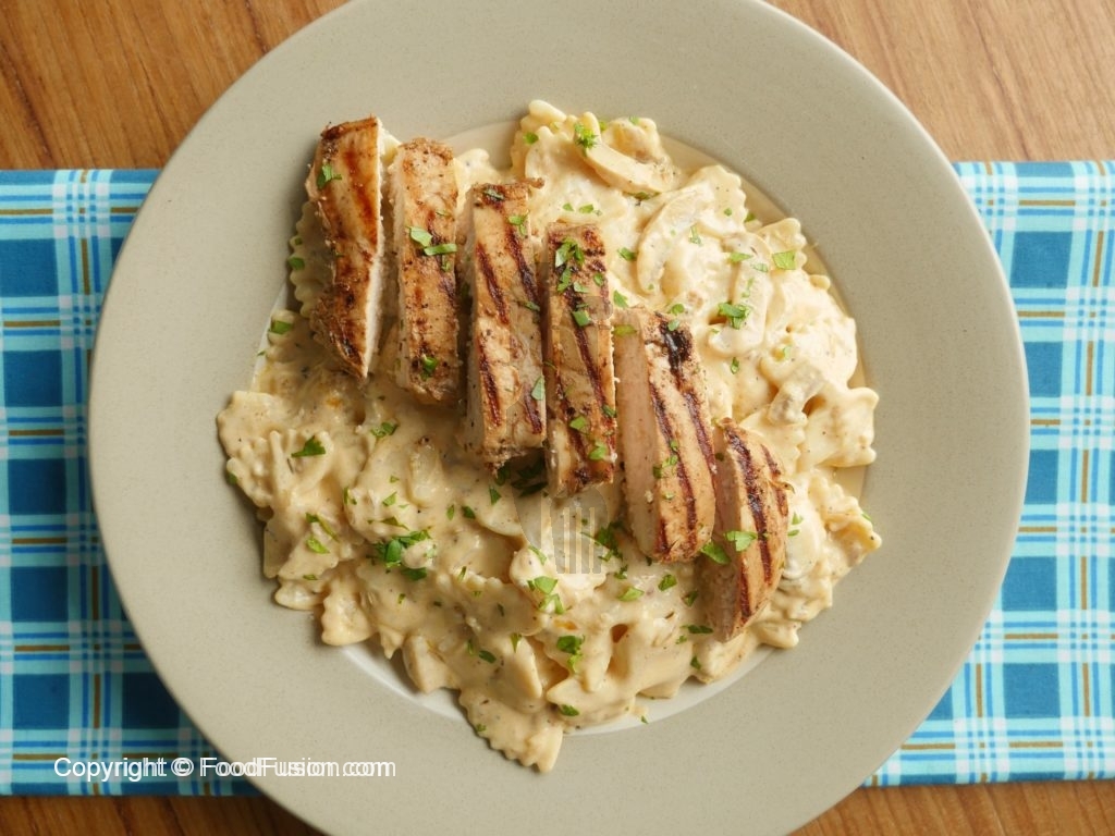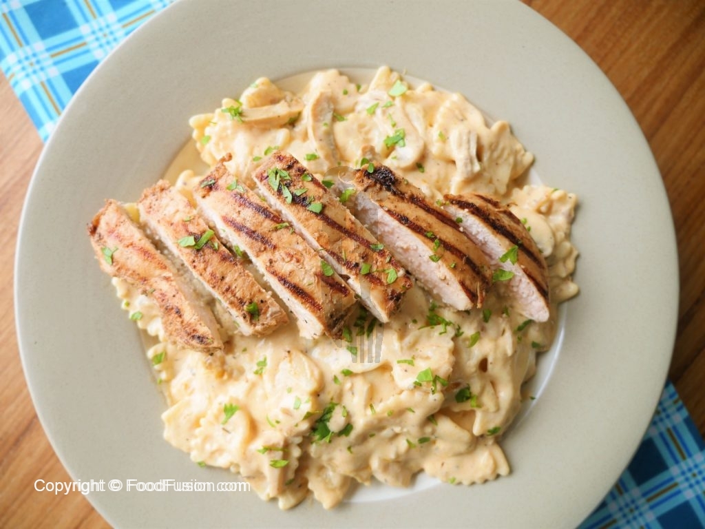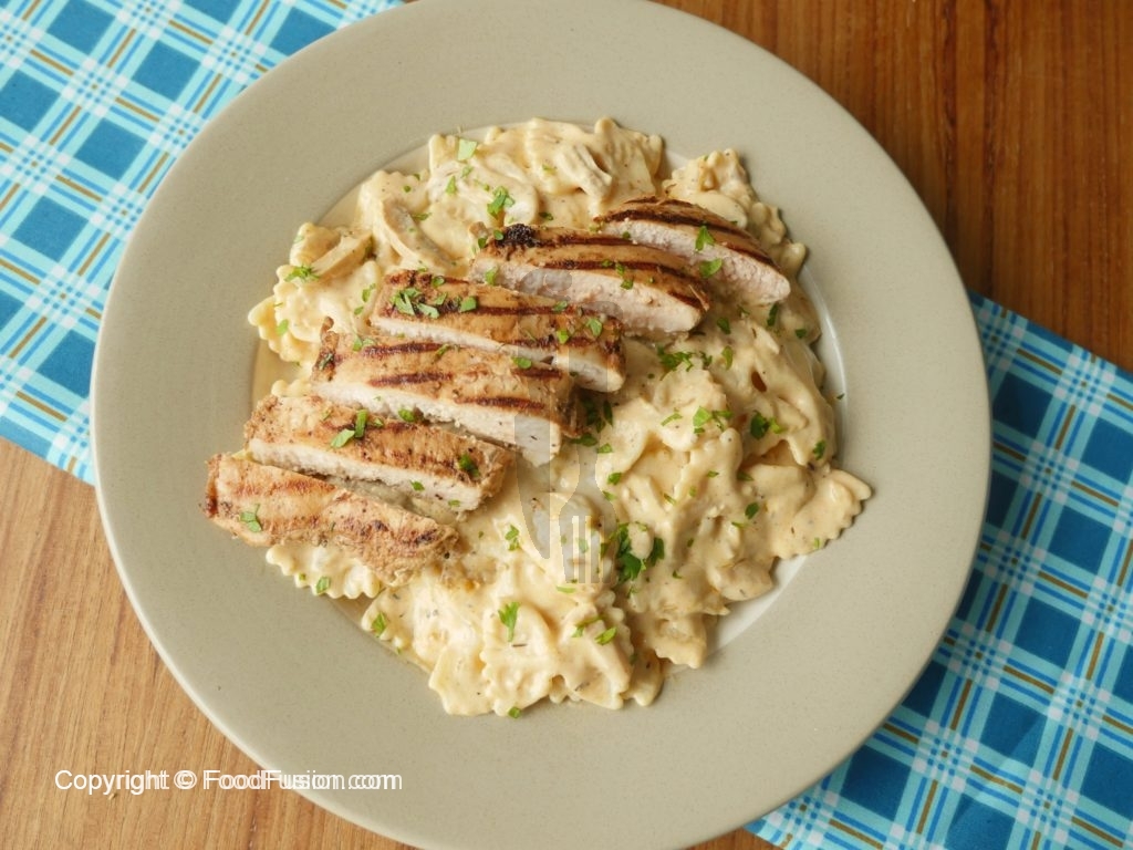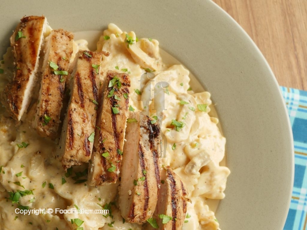 Cut grill chicken fillets into desire shapes,place over cooked pasta & serve.