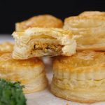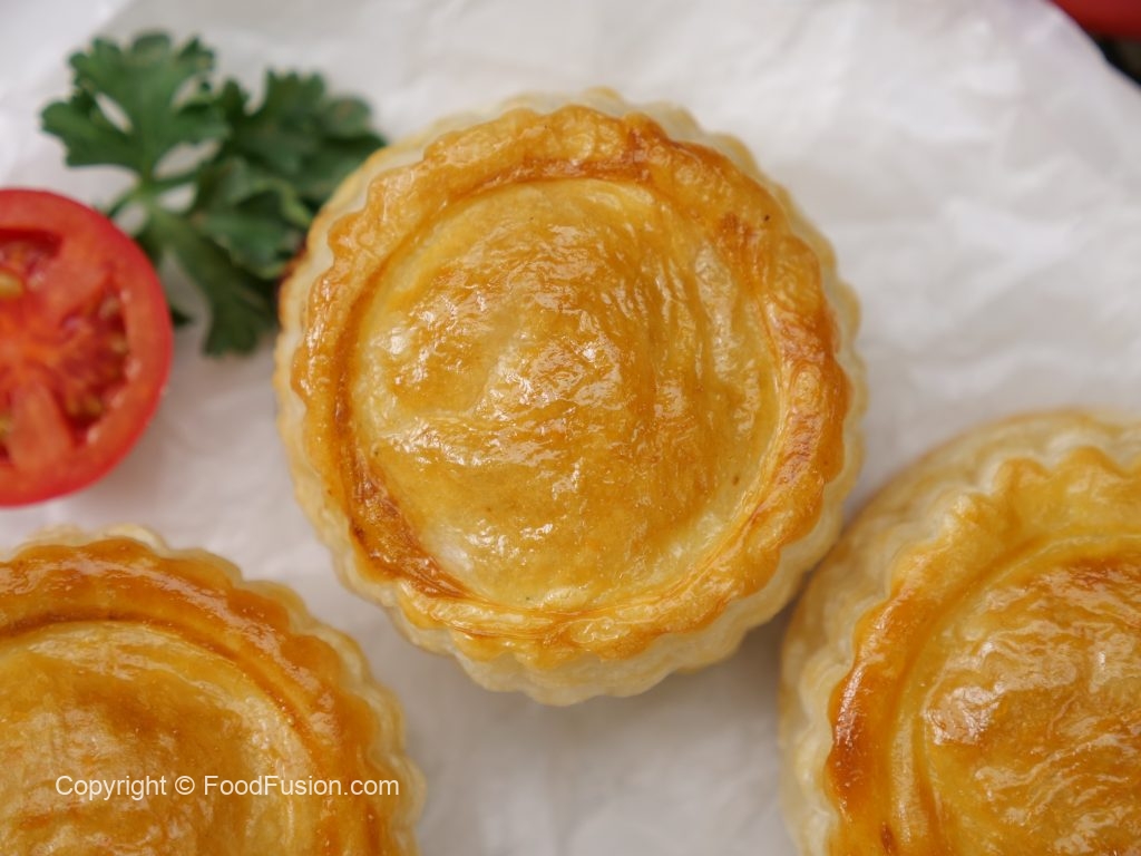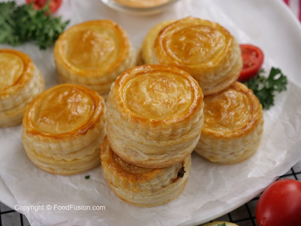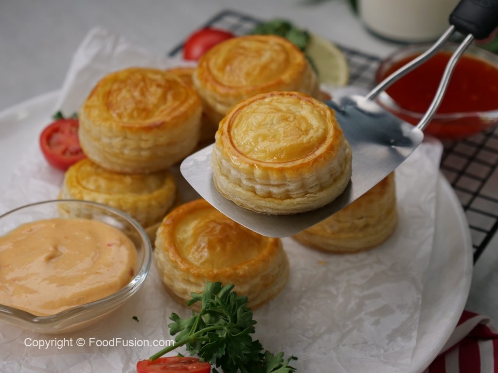 -Apply water,add prepared chicken filling in the center & flip another puff pastry on top to make a patties.