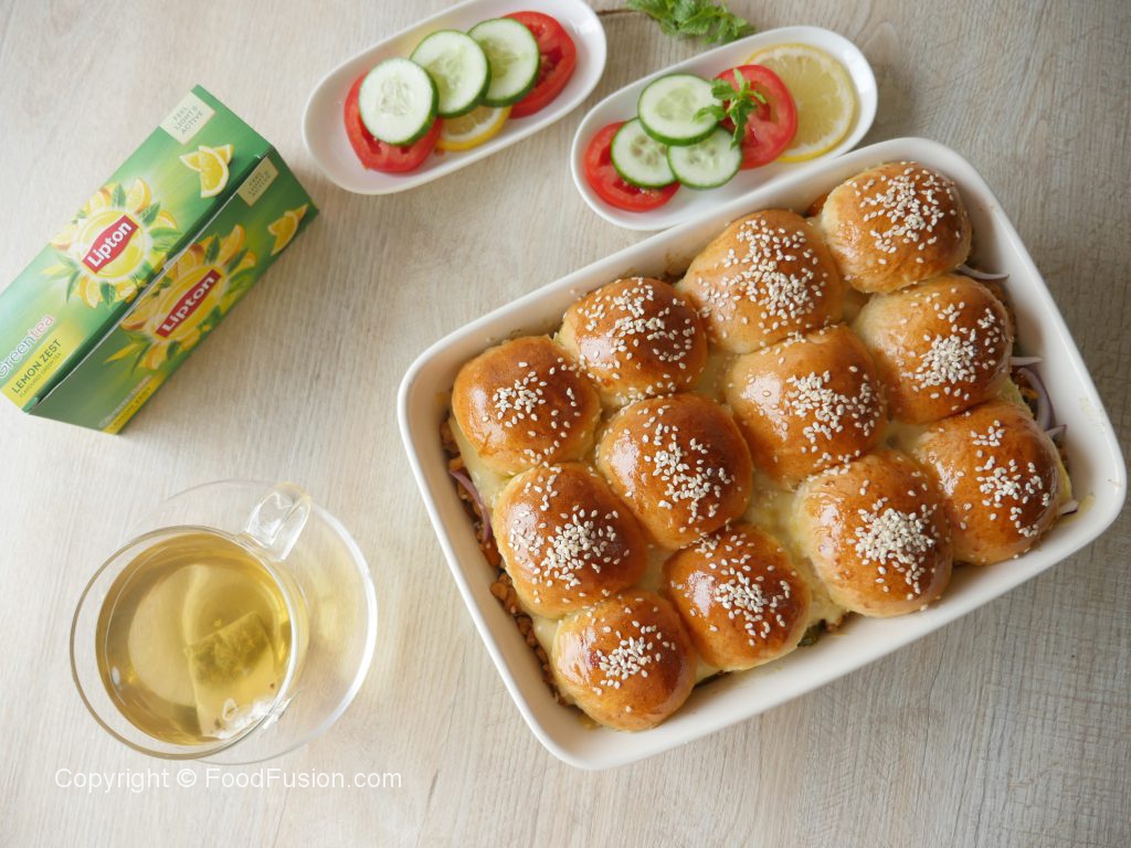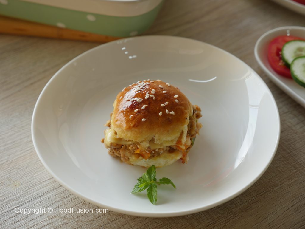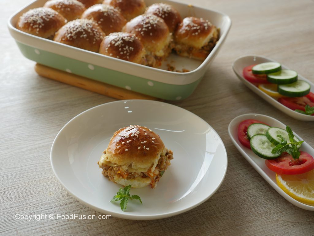 Baking dish mein burger buns rakh ker tomato ketchup,cheddar cheese,cooked chicken mixture,pickled cucumber,pyaz slices aur mozzarella cheese slices dal ker upper sa top buns rakh dein.