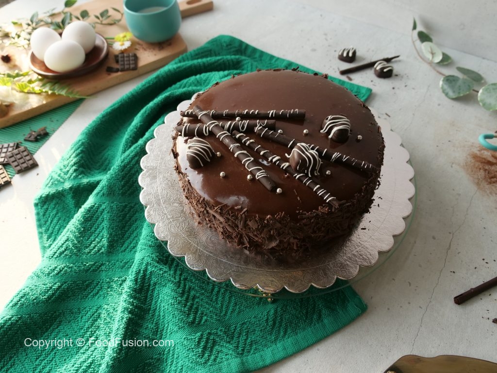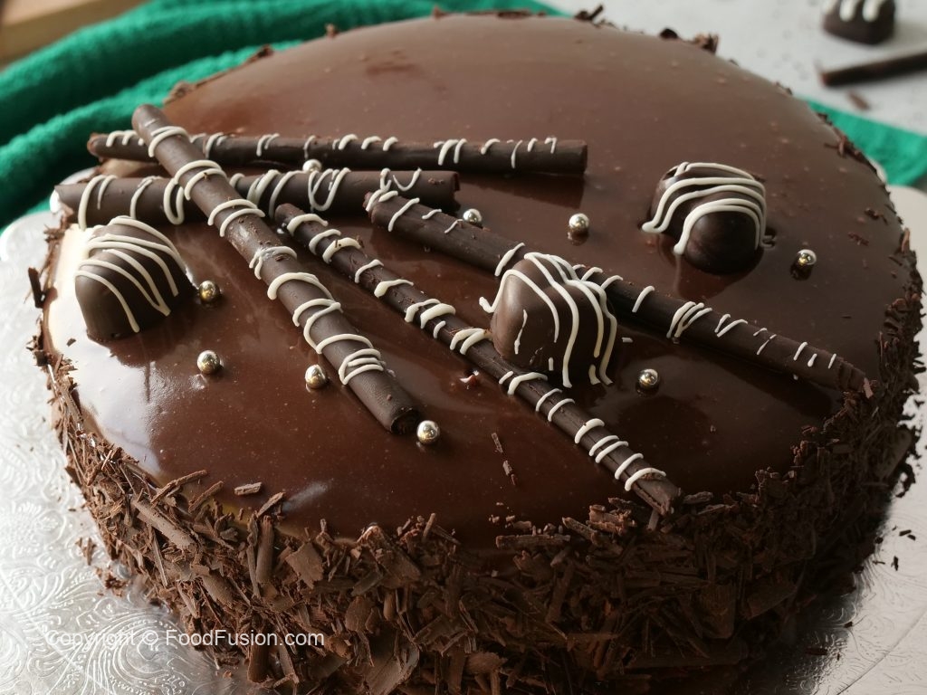 -Reserved warm chocolate ganache ko cake ka upper dal dein,cake ki sides per grated chocolate laga lein aur 30 minutes kliya refrigerate ker lein.