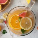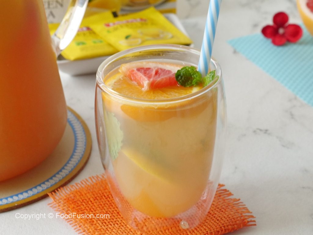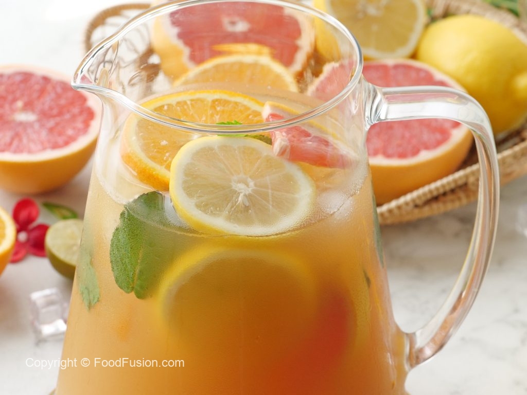 In a jug,add ice cubes,lemon slices,orange slices,grape fruit slices,prepared lemon green tea,grape fruit juice,orange juice,lemon juice and mint leaves,stir & serve!