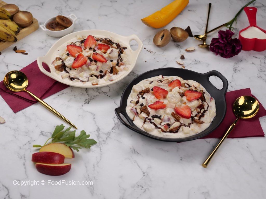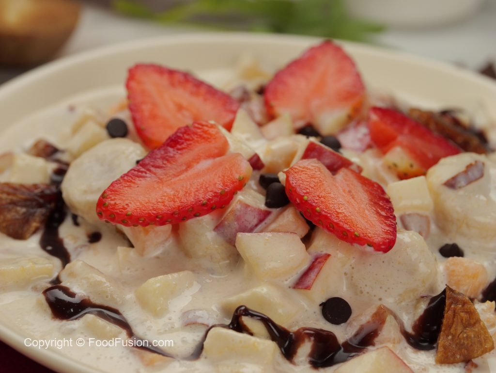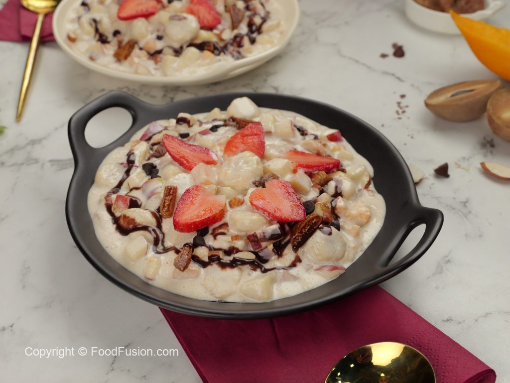 -Fruit bowl mein cream dal ker ache tarhan mix karein aur thanda ho janay tak refrigerate ker lein.-Serving plate mein creamy fruit chaat,injeer,badam,chocolate ganache,creamy fruit chaat & chocolate chips dal dein & strawberry sa garnish ker ka serve karein!