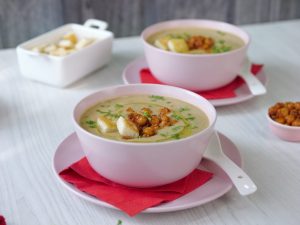 -In a bowl,add cream & add ½ cup of soup in cream to temper it.
