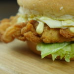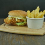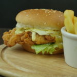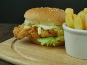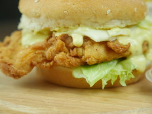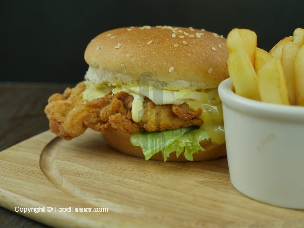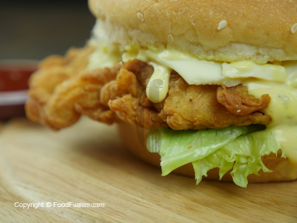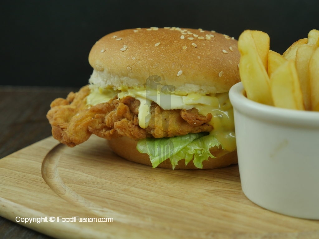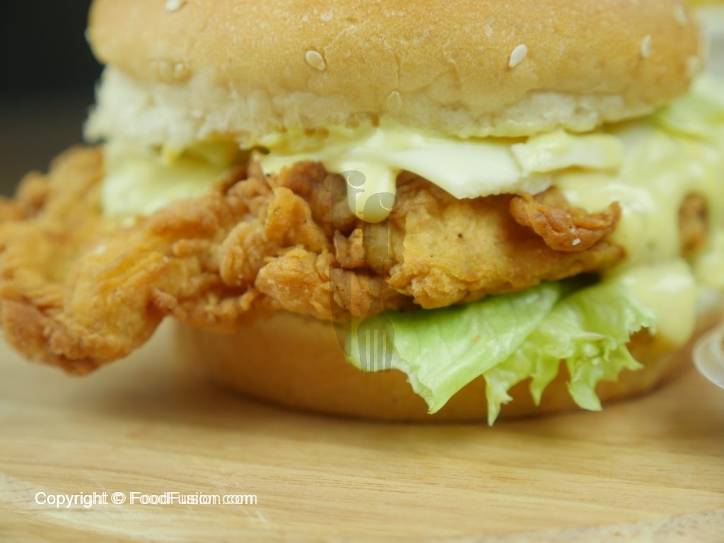 For assembling,take burger buns. Apply mayonnaise on bun. Add ice burg leaf, fried chicken fillet, mayo sauce, cheese slice and then cover with the bun.