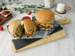 -Burger bun per mayonnaise laga lein,iceberg,crispy fried chicken,tayyar spicy mayo sauce,tayyar cheese patty,spicy mayo sauce,iceberg & pickled jalapenos dal dein.
