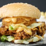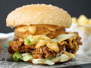 -On burger bun,add & spread mayonnaise,iceberg,crispy fried chicken,prepared spicy mayo sauce ,prepared cheese patty,spicy mayo sauce,iceberg & pickled jalapenos.