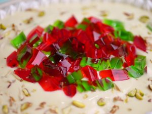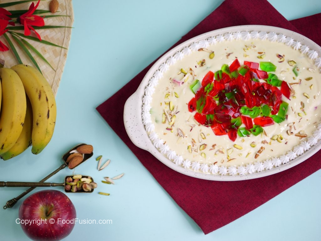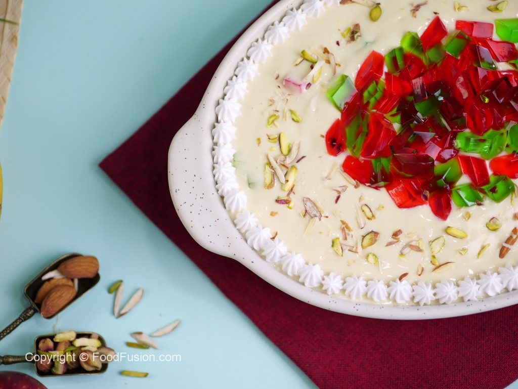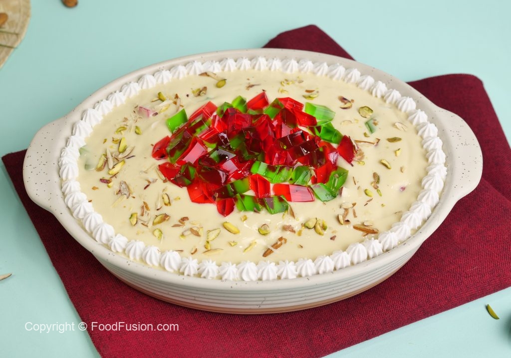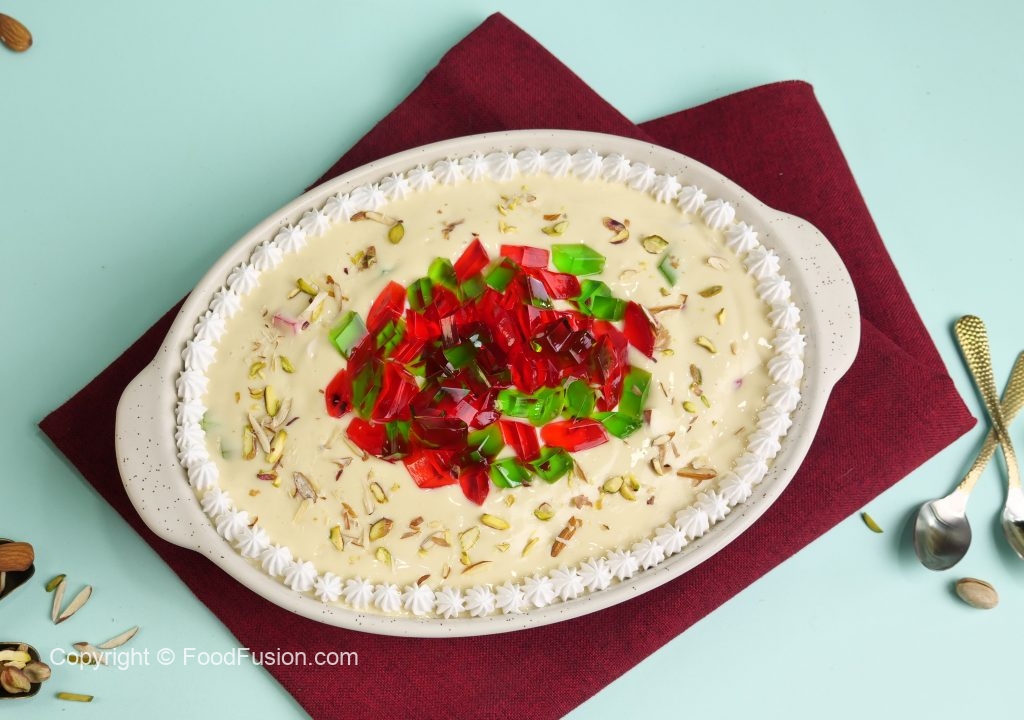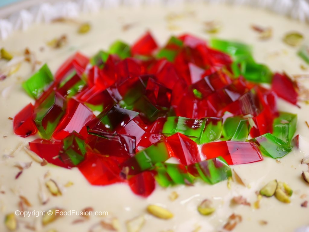 -Whipped cream,red & green jelly,pista ur badam sa garnish ker ka thanda serve karein.