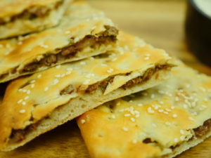 -Add & spread prepared mince filling on each cut portion of the dough except one portion then flip each filled portion on center part one by one & in the last flip plain portion,sprinkle dry flour & press gently & roll out with the help of rolling pin.