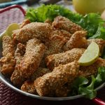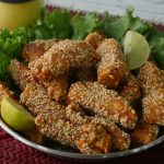On each fish piece,sprinkle sesame seeds.