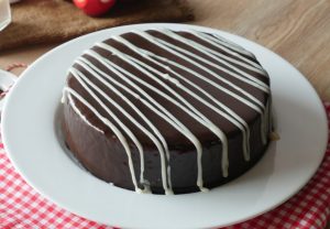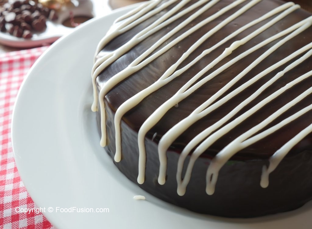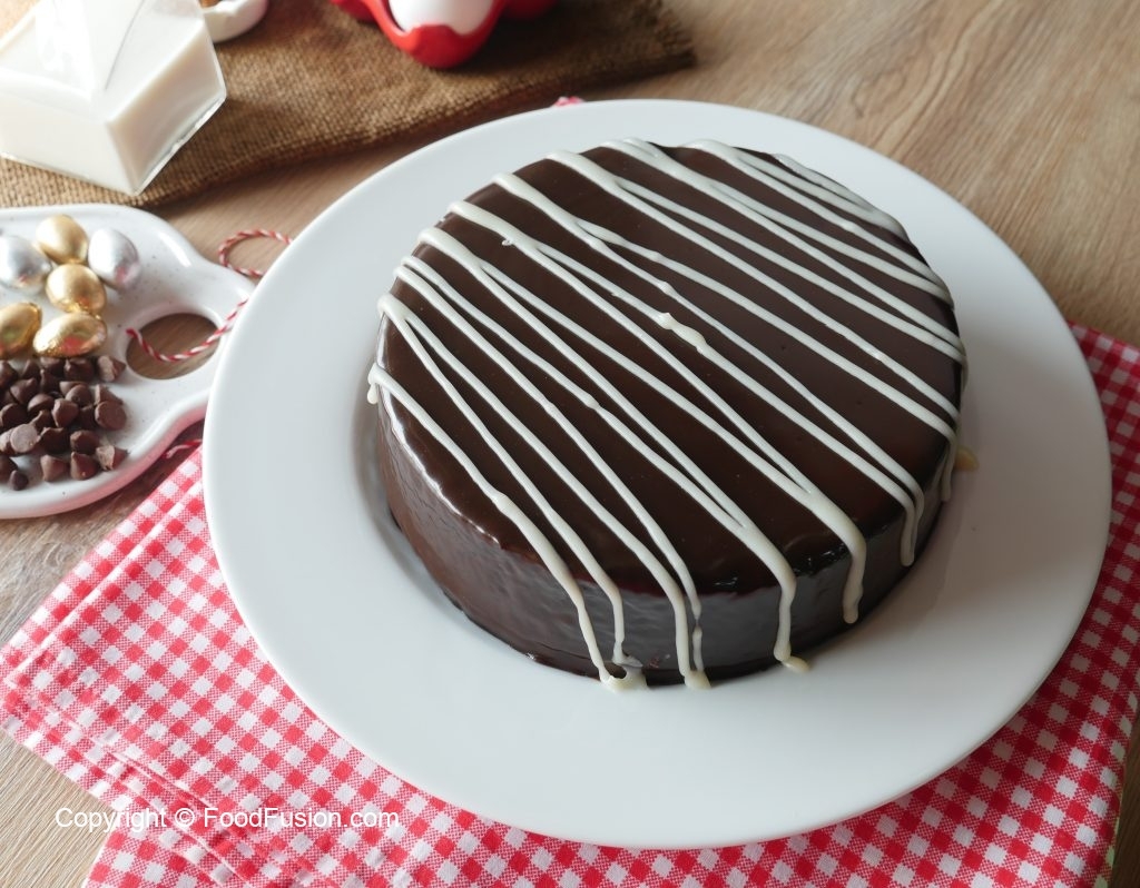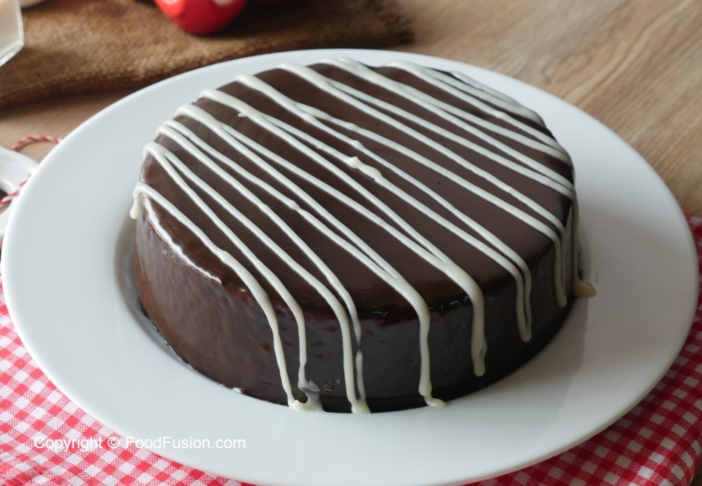 Pour prepared chocolate ganache all over the cake and let it set for 30 minutes.