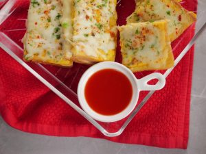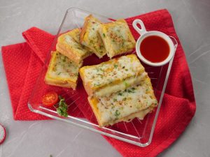 -Add mozzarella cheese,fresh parsley,red chilli crushed,cover & cook on low flame until cheese melts (makes 2) & serve!