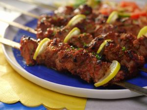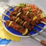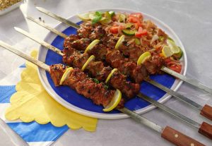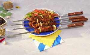 -Thread marinated beef on metal skewer (makes 6).