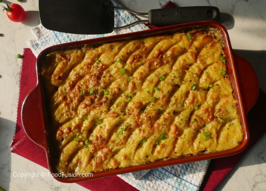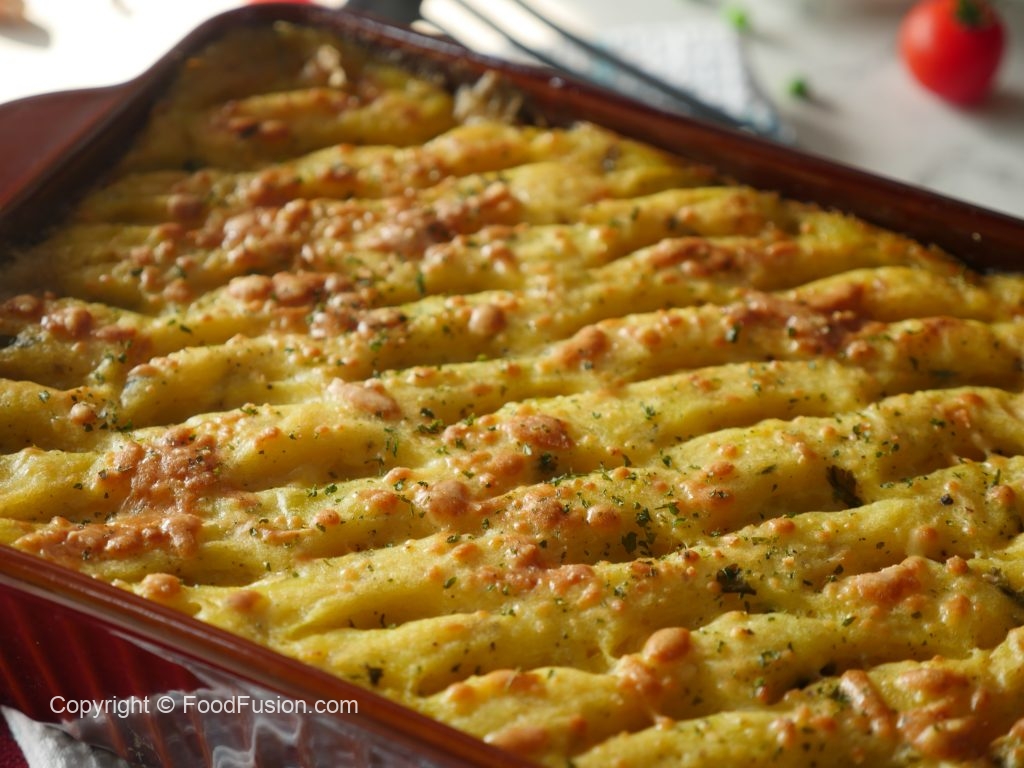 In a 10 x 4 inch baking dish layer prepared sauce, fried fish, mozzarella cheese, cheddar cheese & prepared creamy potato. Level it with the help of spoon & make some design.