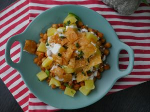 On serving plate,add cooked chickpeas,boiled potato,green chili,yogurt,papri,fresh coriander & serve!