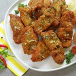 -Now coat marinated strips with all-purpose flour than dip in whisked eggs & coat with breadcrumbs.