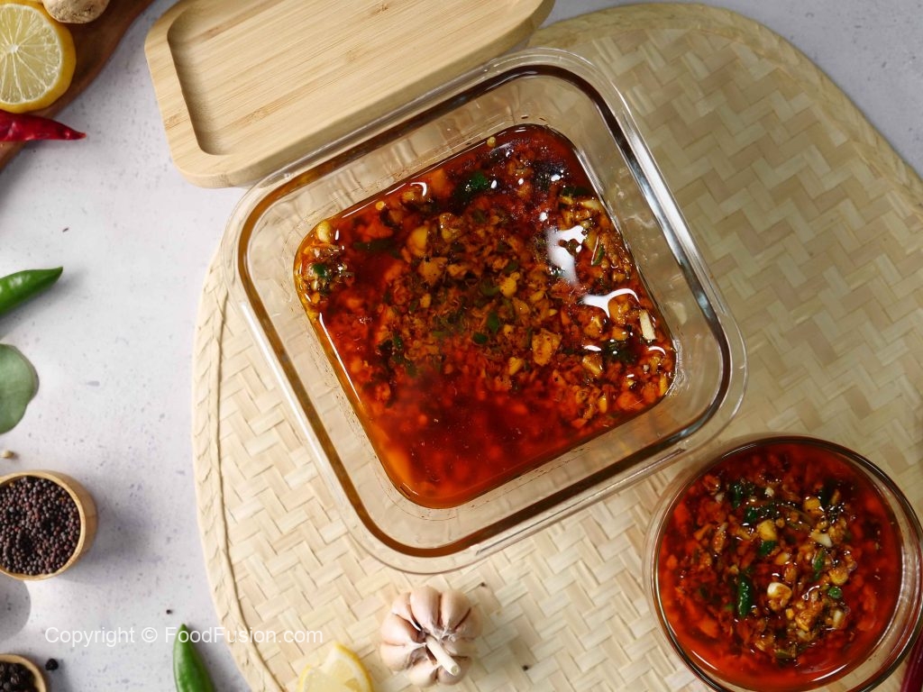 -Add hot mustard oil in pickle & mix well,cover & let it rest for 10 minutes.