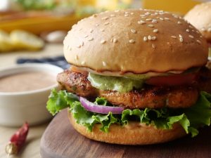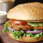 On burger bun,add & spread bbq burger sauce,lettuce leaves,onion rings,chicken chapli kabab,tomato slice and prepared chatpati hari chutney.