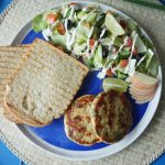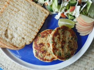 Serve healthy chicken patties with toasted bran bread & salad.