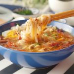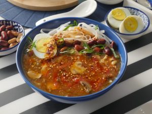 Serving bowl mein rice noodles,hot and sour soup,fried mong phali,hara pyaz leaves,boiled anda,chilli oil aur hara pyaz leaves dal ker serve karein!