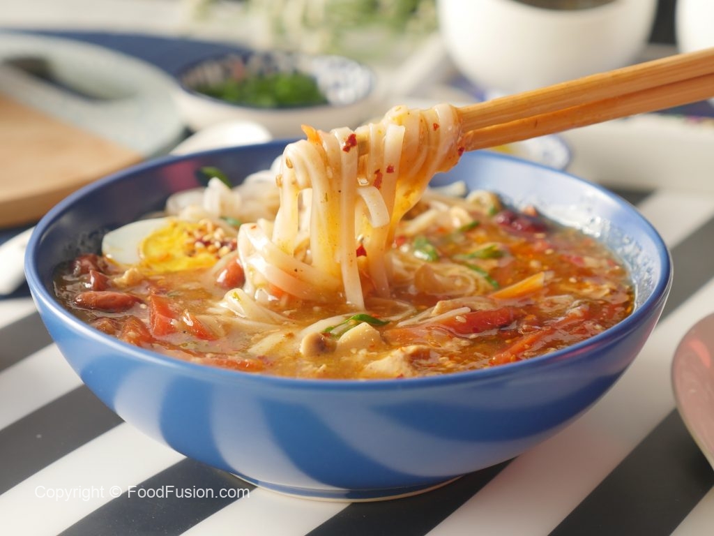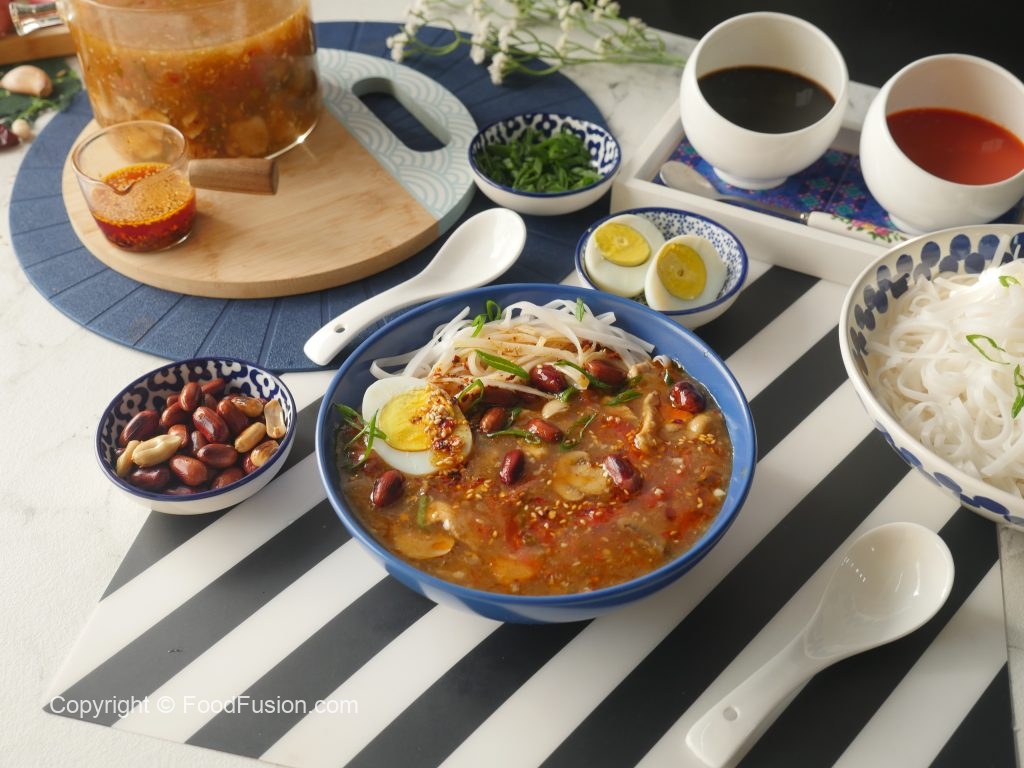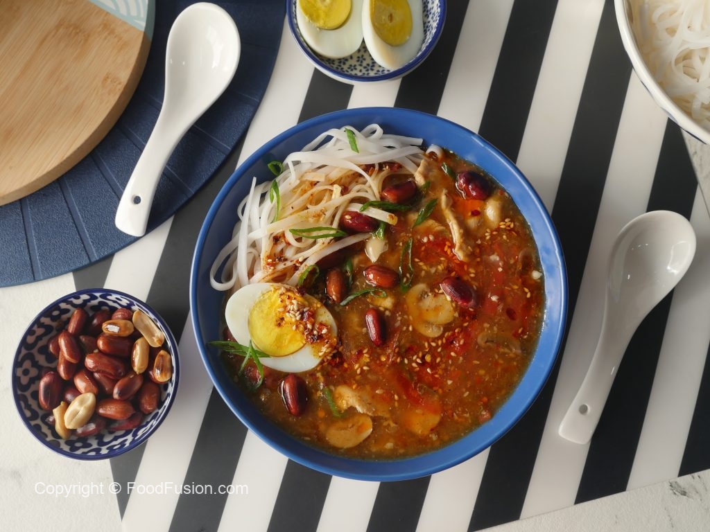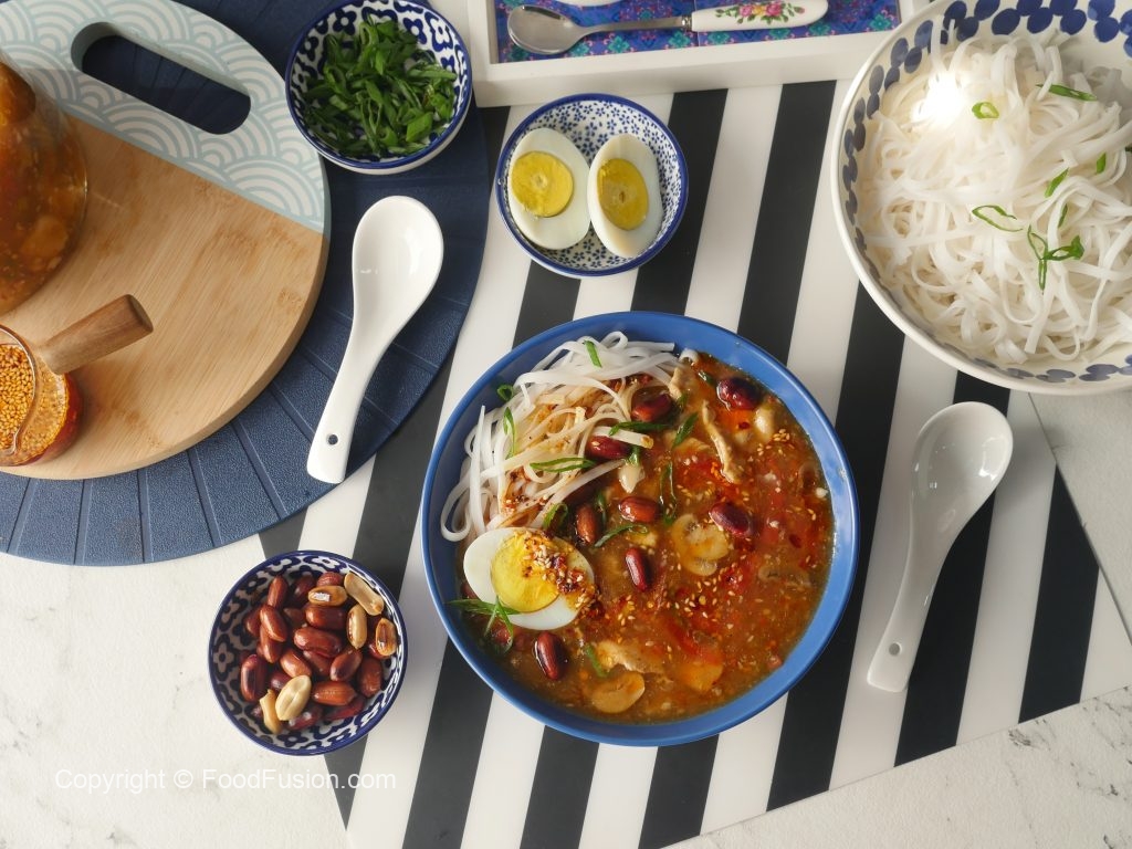 In serving bowl,add rice noodles,hot and sour soup,fried peanuts,green onion leaves,boiled egg,chilli oil,green onion leaves & serve!