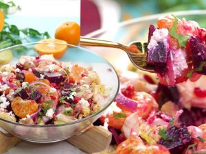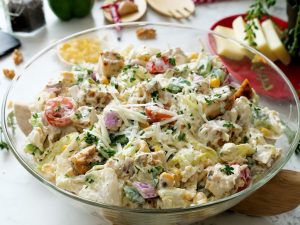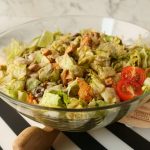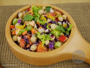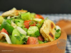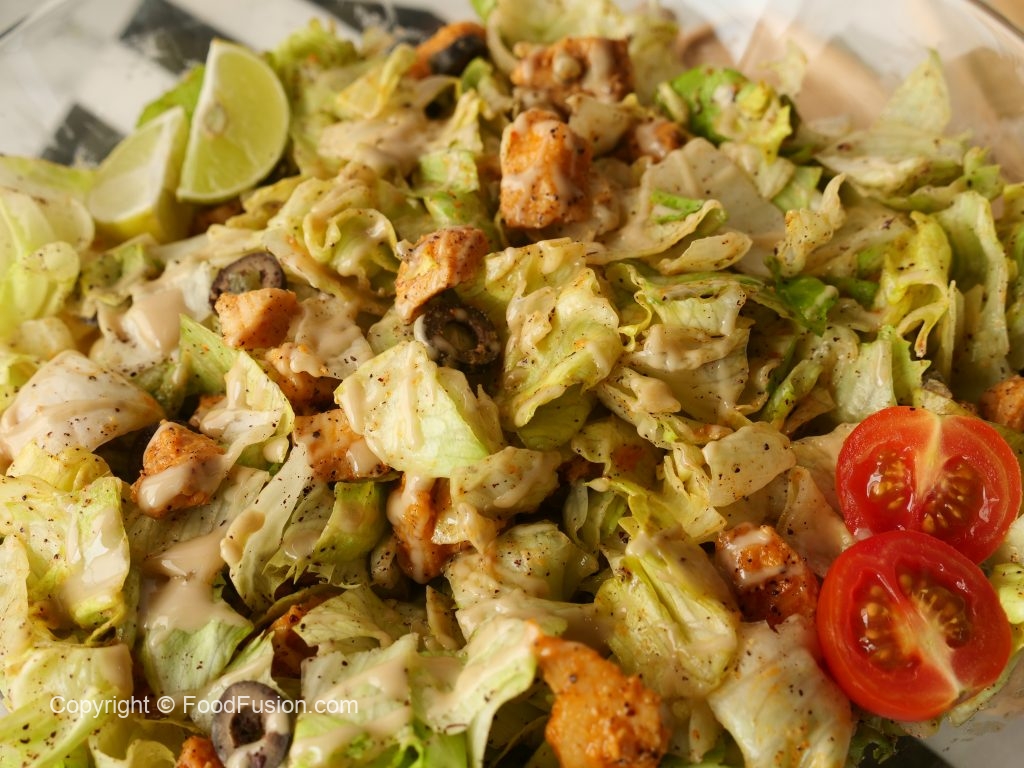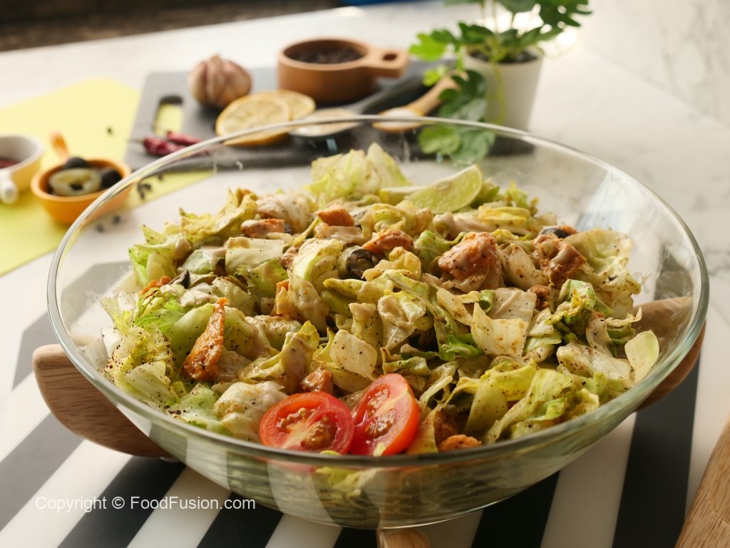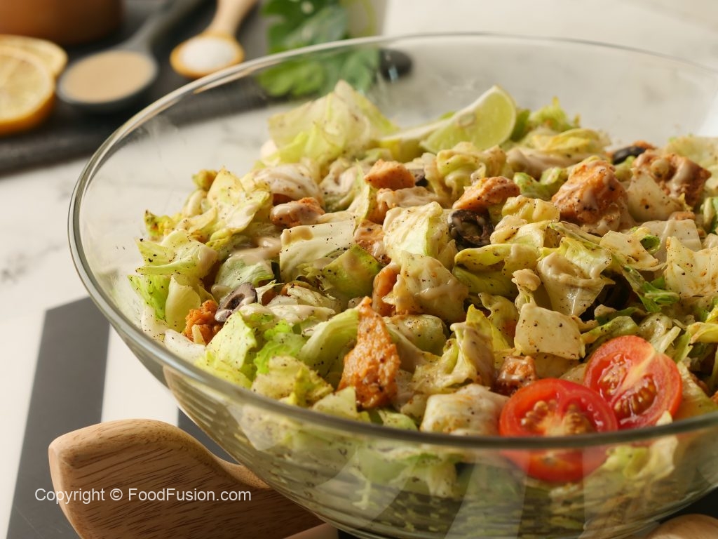 -Bowl mein chopped iceberg lettuce,olives,pickled jalapenos,sumac powder,darchini powder aur lemon juice dal ker ache tarhan mix aur toss ker lein.